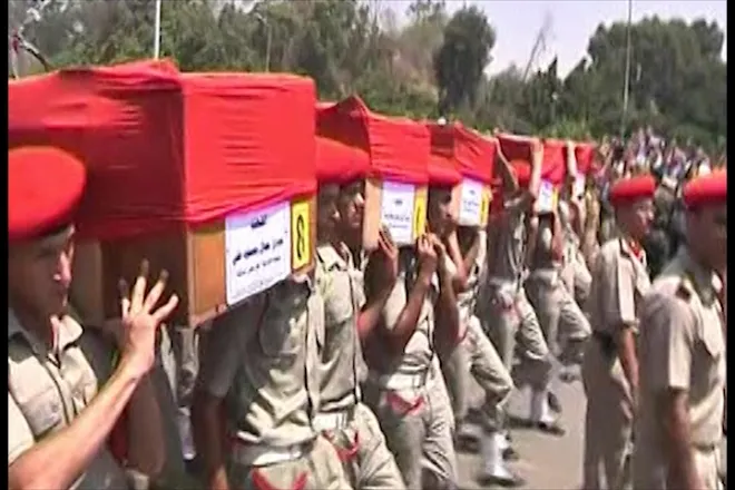 Egypt has retaliated, just days after these emotive scenes as hundreds of people – members of the public and police officers alike - joined in a funeral procession for some of 16 Egyptian border guards who were slayed at their checkpoint in Sinai.