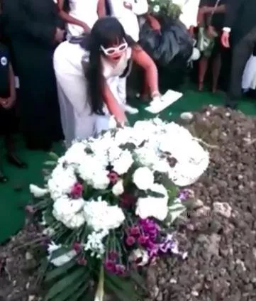 Rihanna dresses in white to lay wreath at cousin's funeral before breaking down in tears